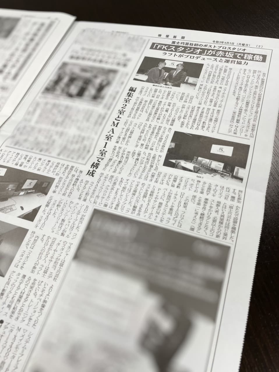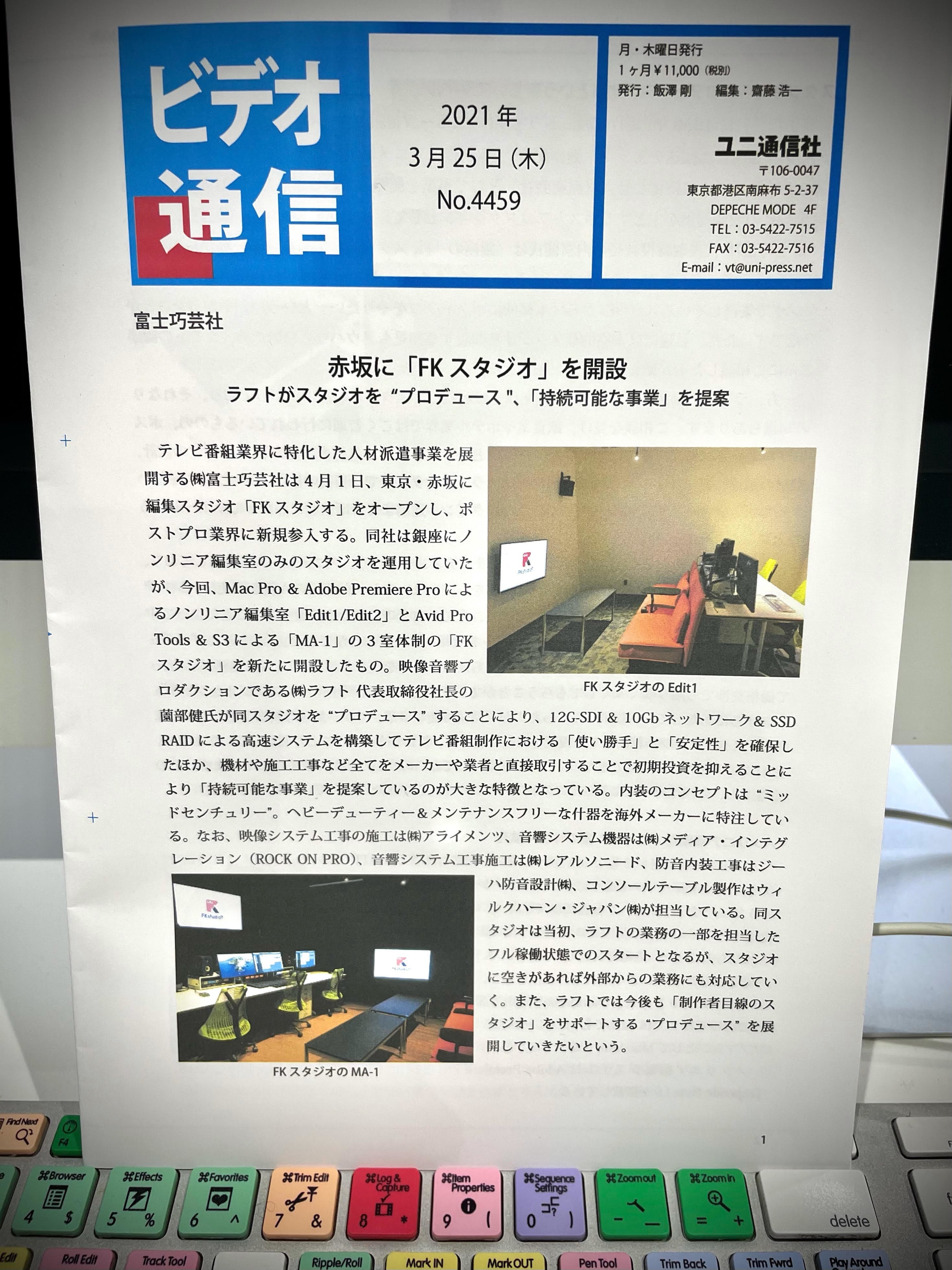 RAFTプロデュースによる富士巧芸社様のFK Studioが来る2021年4月1日、赤坂一ツ木通り沿いにオープンします。Adobe Premiereベースのノンリニア2室、AVID ProToolsベースのMA1室の構成です。ぜひよろしくお願いします。